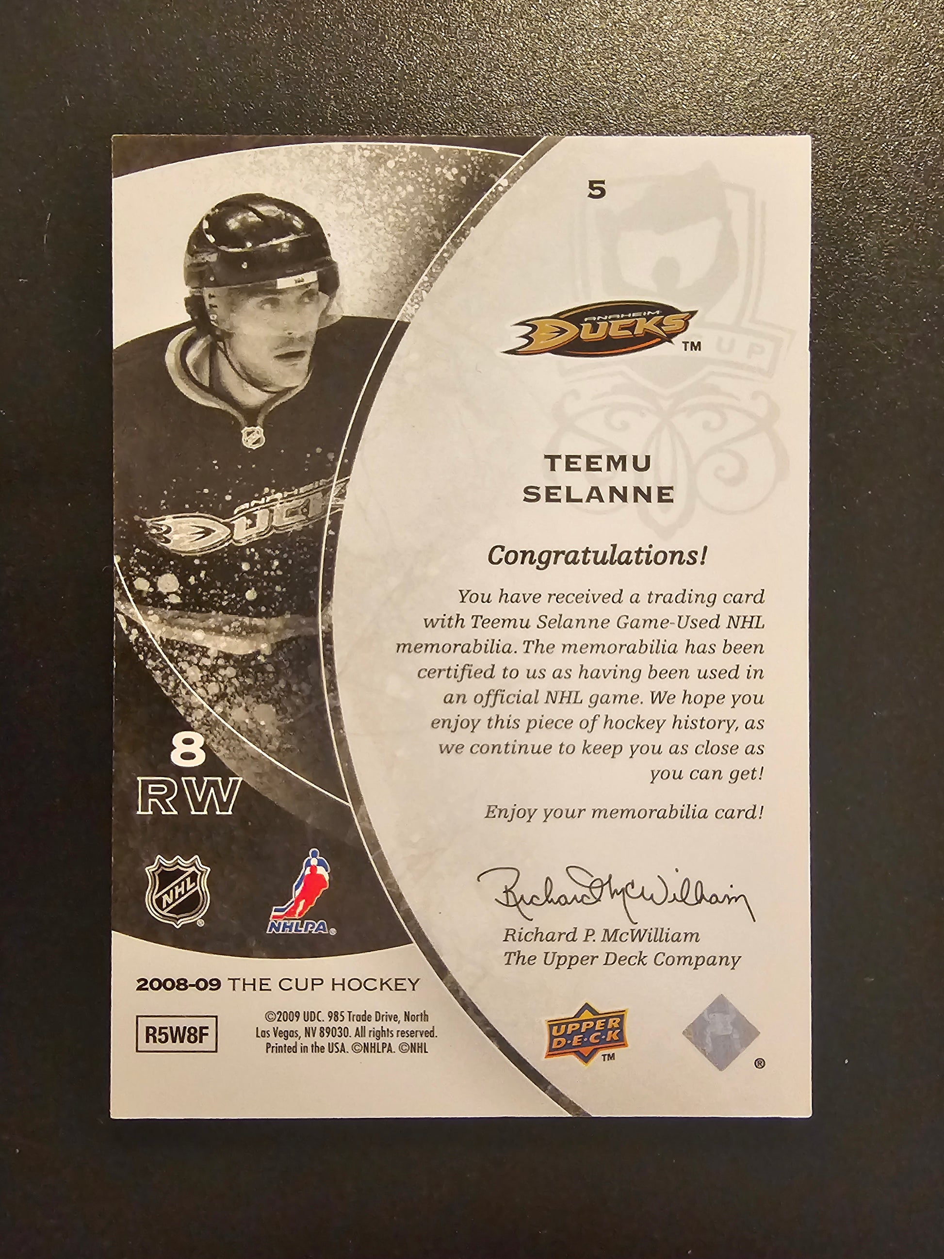 2008-09 Upper Deck The Cup - Gold Rainbow Patch - Teemu Selanne #5 Numbered with game number 8/10