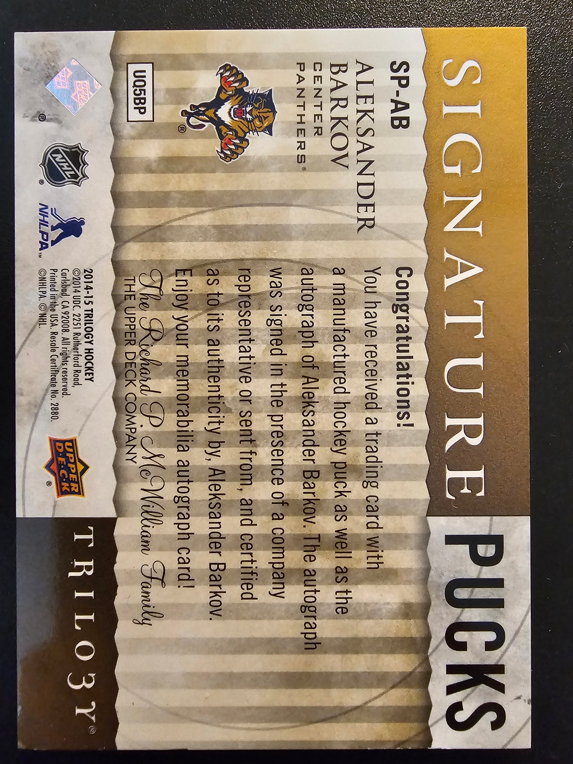 2014-15 Upper Deck Trilogy - Signature Pucks - Shield Logo - Aleksander Barkov #SP-AB /3