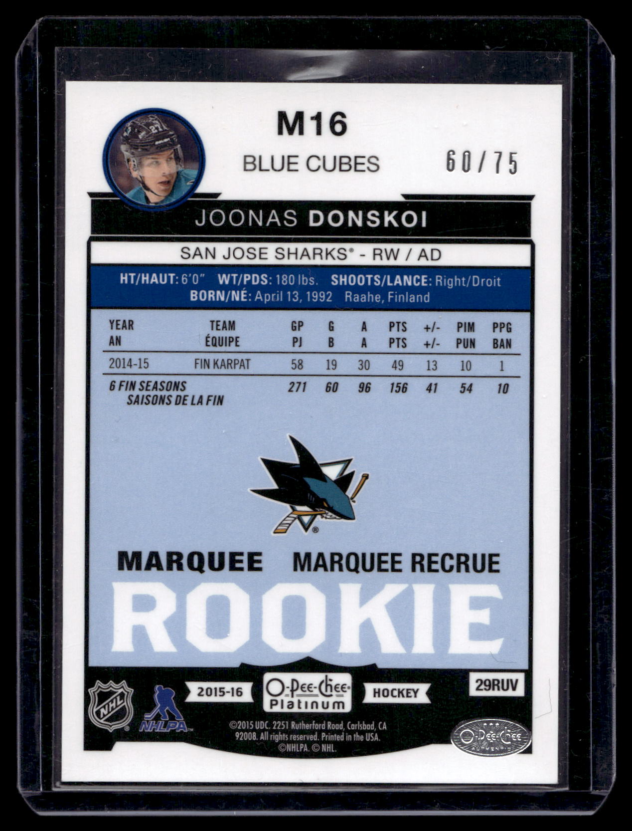 2015-16 Upper Deck O-Pee-Chee Platinum - Marquee Rookies Blue Cubes - Joonas Donskoi #M16 /75 RY