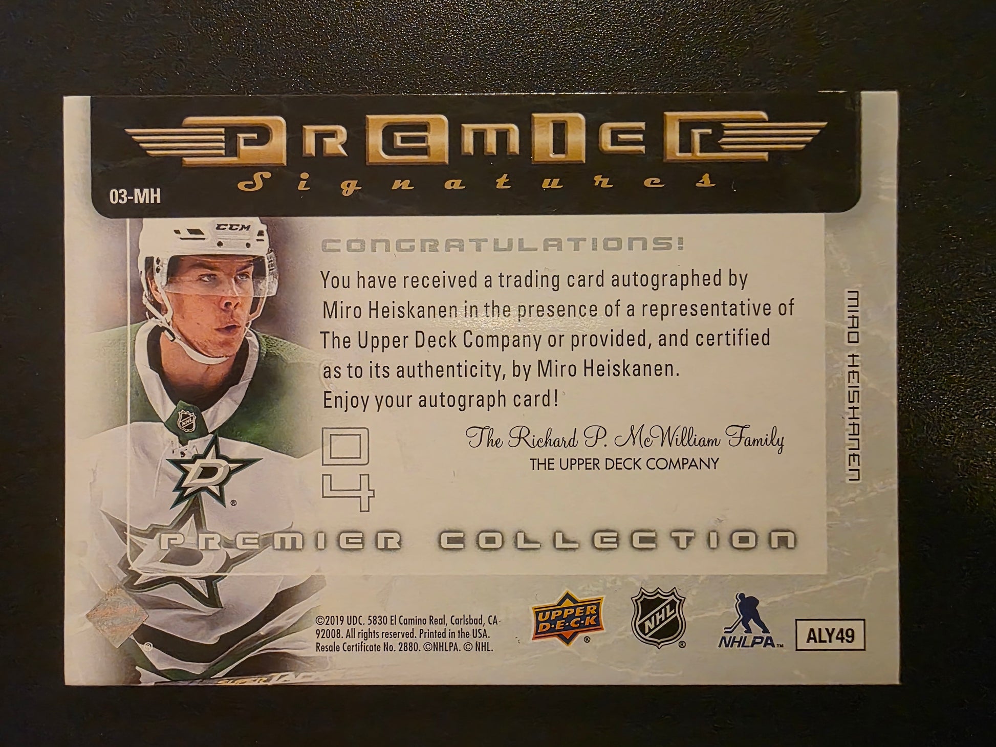 2018-19 Upper Deck Premier - 2003-04 Retro Premier Signatures Rookie - Miro Heiskanen #03-MH /99 RY